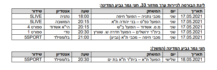 מכבי והפועל חיפה הוגרלו היום 110619 בבורסה לניירות ערך בתל אביב ללוח המשחקים לעונה הקרובה בליגת העל שתקרא גם ליגת הבורסה לניירות ערך שמה של ליגת העל בעקבות שינוי הספונסר ובליגה הלאומית. רכב חדש מחכה לזוכה הגדול בליגת החלומות. הפסקת הליגה עד להודעה חדשה או קיום ליגה בקצב מוגבר כלומר בין שניים לשלושה מחזורים.